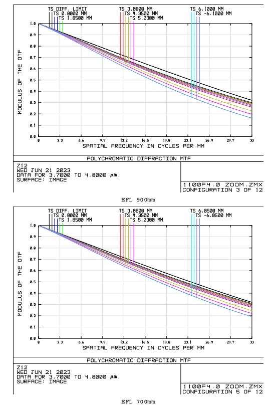 Рисунок 5 описывает MTF кривые для объектива с длинным диапазоном обнаружения, как показано на рисунке, как для сагиттальной, так и для тангенциальной MTF, они близки к диффракционному пределу. (Вы можете скачать PDF-версию в верхней части страницы, чтобы ознакомиться с полным вариантом MTF кривой.) Диффракционно ограниченный дизайн позволяет достичь наилучшей функциональности.